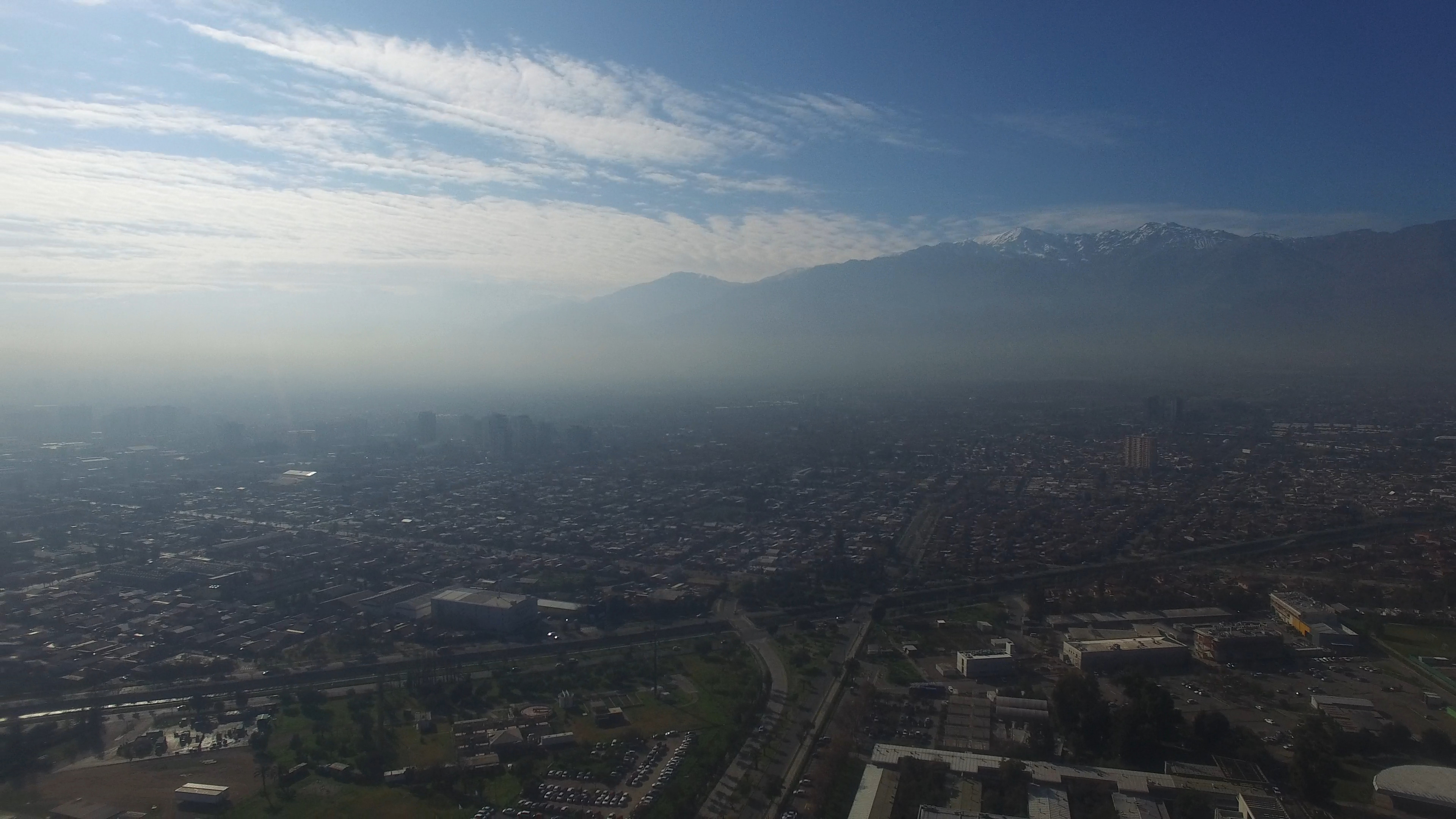 También adjuntamos una fotografía de Santiago y los Andes con contaminación del aire 5. Julio 2016. Esta foto es parte de un video grabado con el Dron (haga clic aquí para ver imagen con alta resolución):